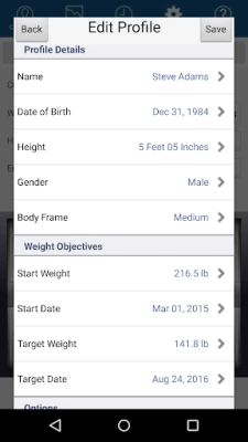 This app will also suggest your ideal weight and recommend the amount of time needed to reach that target based on your current weight, height, body frame, gender and age. You may, of course, choose to alter the suggested targets based on your own plans.